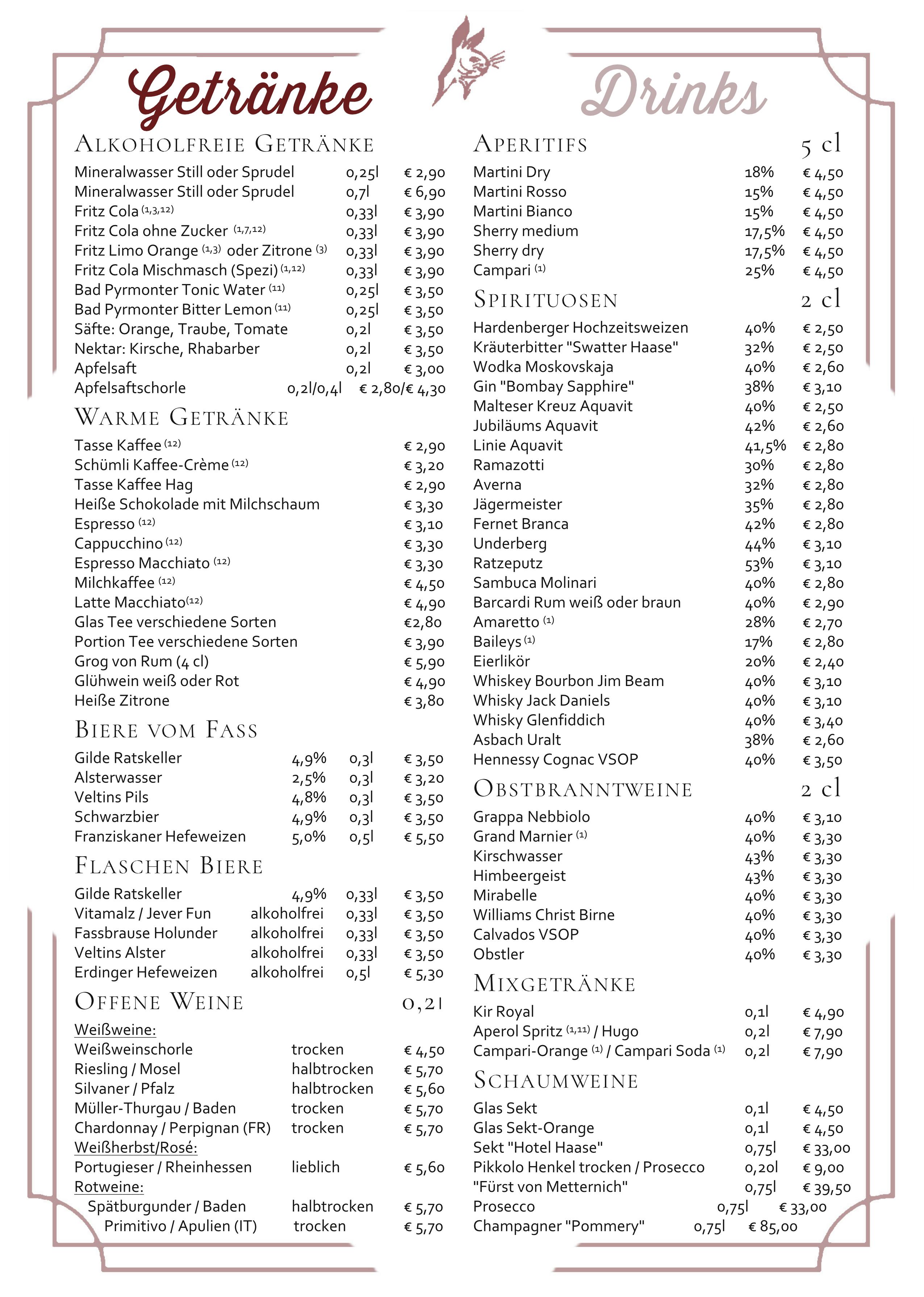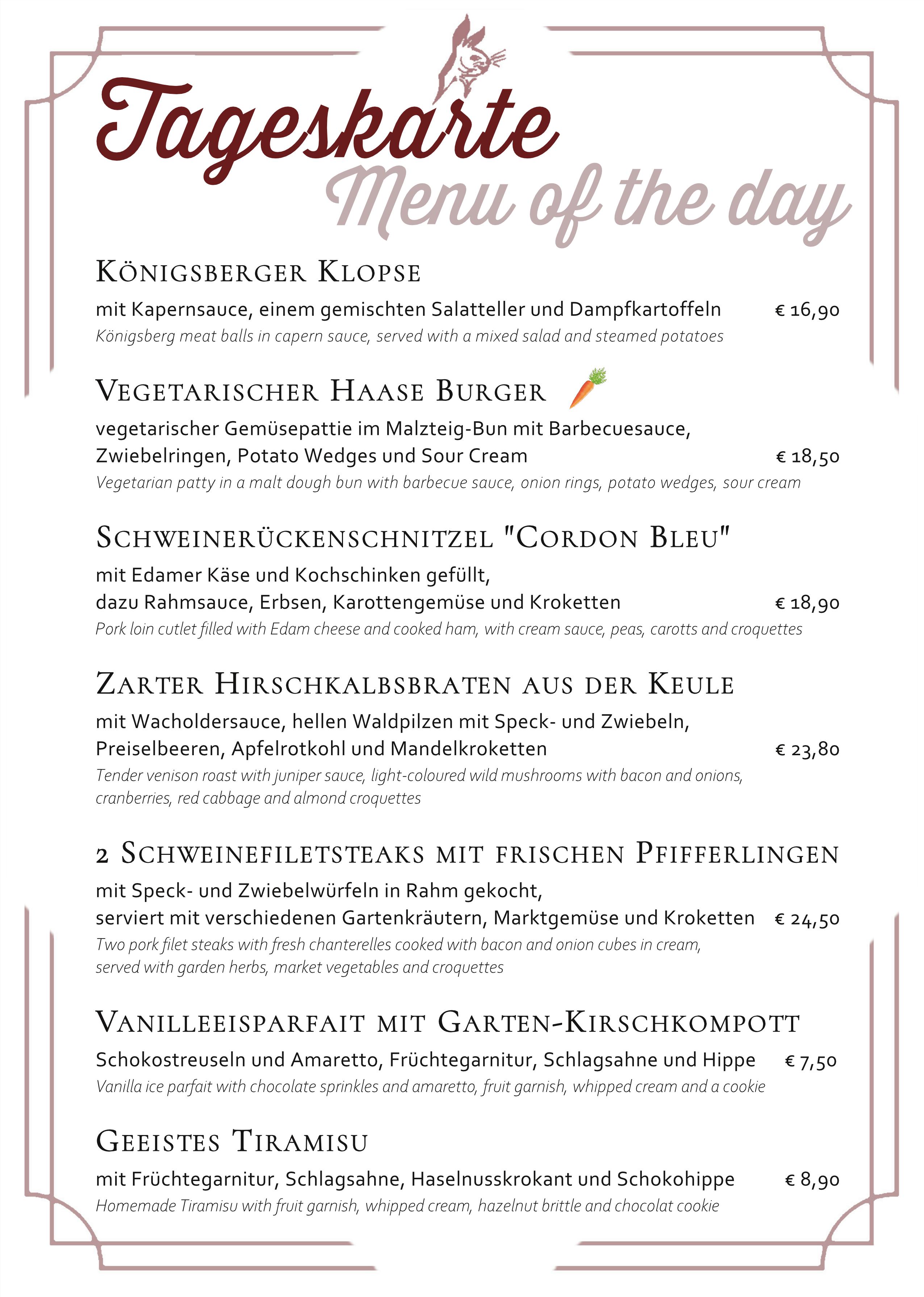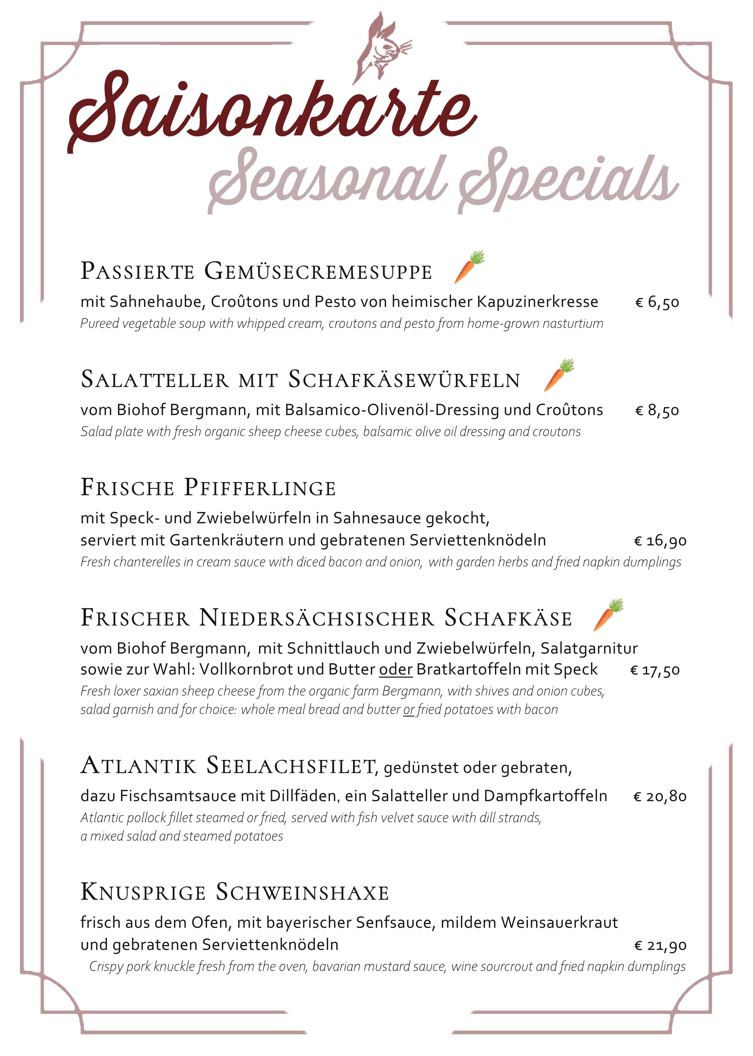 Tageskarte, saisonale Empfehlungen und Getränke