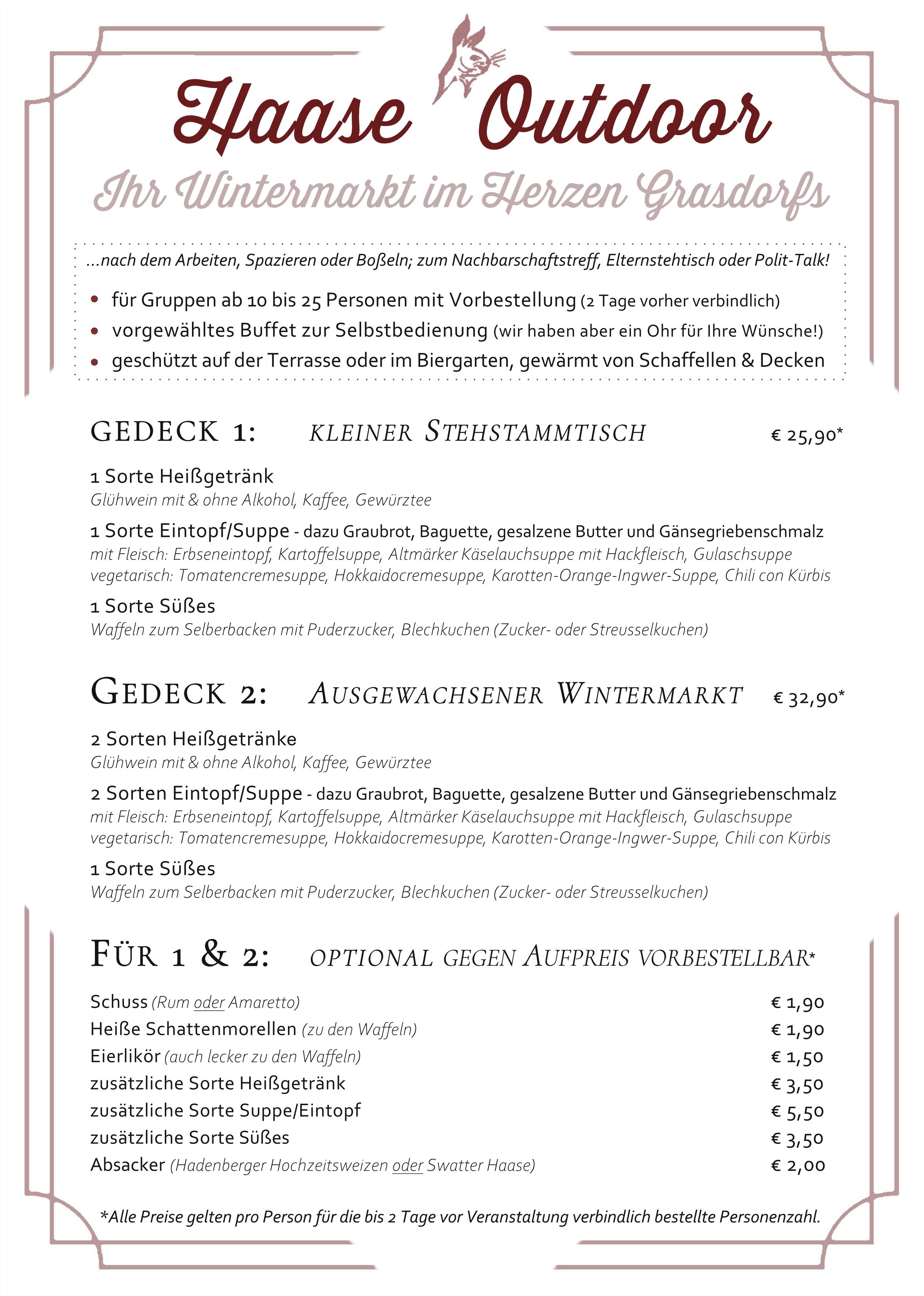 - 2 pauschale “Gedecke” mit einheizenden Speisen & Getränken zur Auswahl